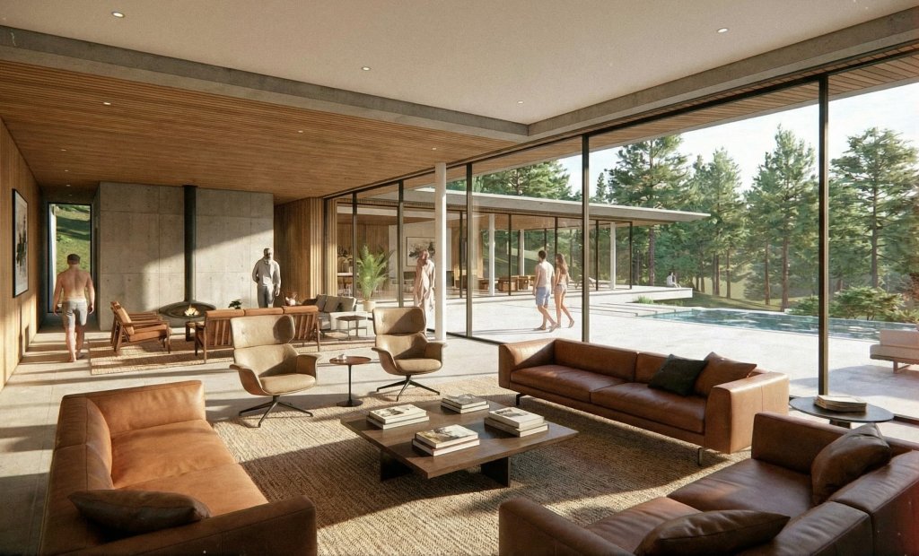 Upon entering, one is greeted by a spacious, open-plan living area bathed in natural light. Floor-to-ceiling windows offer breathtaking views of the surrounding greenery, blurring the lines between indoor and outdoor spaces. The modern fireplace, a focal point of the room, provides warmth and ambiance during colder months.